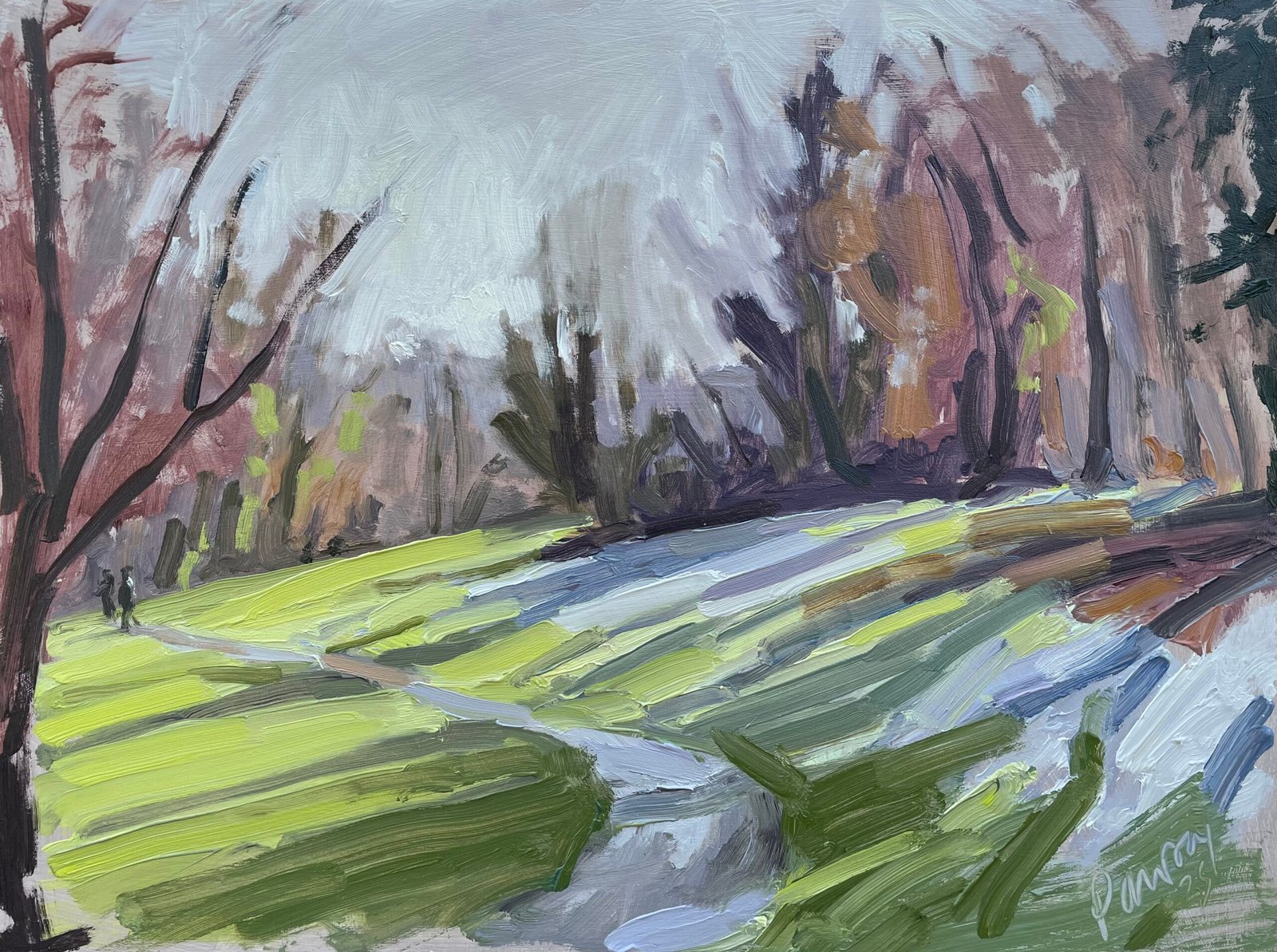 I had intended to paint elsewhere, but was captured as I drove past the entrance to this park. The hazy, early morning sun glowing through the trees, and the frosty lawn patterned with long shadows was too much to ignore. I don’t usually place people in my work, but decided to add them to help with perspective. I love the loose, slightly abstract quality to this piece. Painted start of February 2025 in two hours.