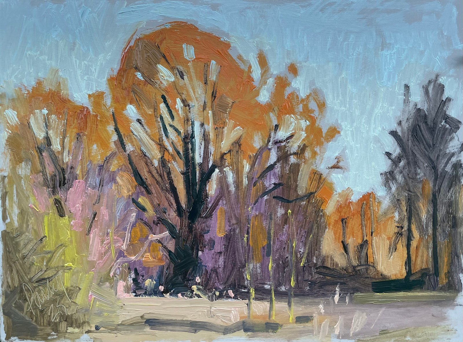 This was the second painting of one day. I’d noticed those bright orange trees earlier in the day, and felt compelled to capture them before the day was over. I love the colours of Winter, and thoroughly enjoyed sketching them down before sunset. Painted start of February 2025 in one hour.