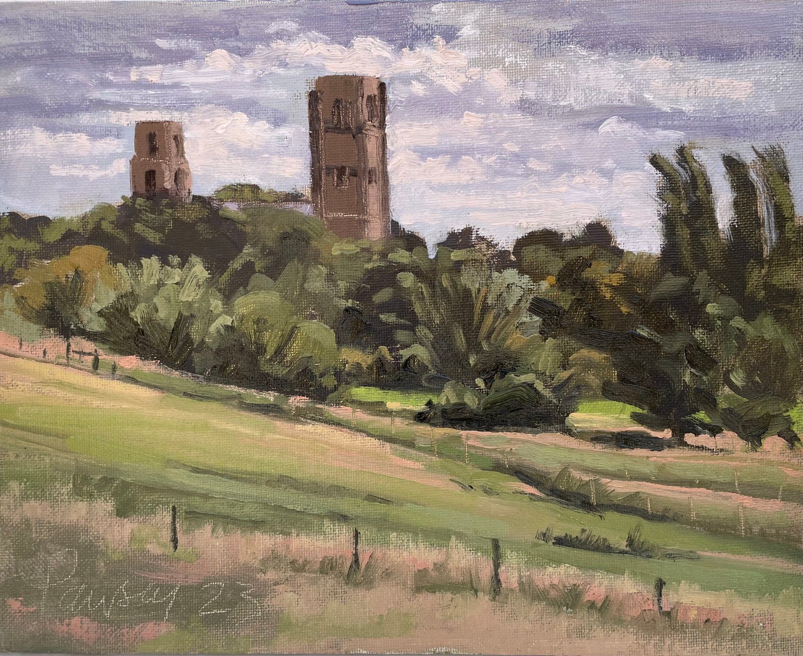 A glorious view from Chapel Lane, looking down onto the pastures of the Tiffey Valley, and one of the grandest religious buildings in East Anglia – Wymondham Abbey. Painted on an afternoon, at the end of June 2023.