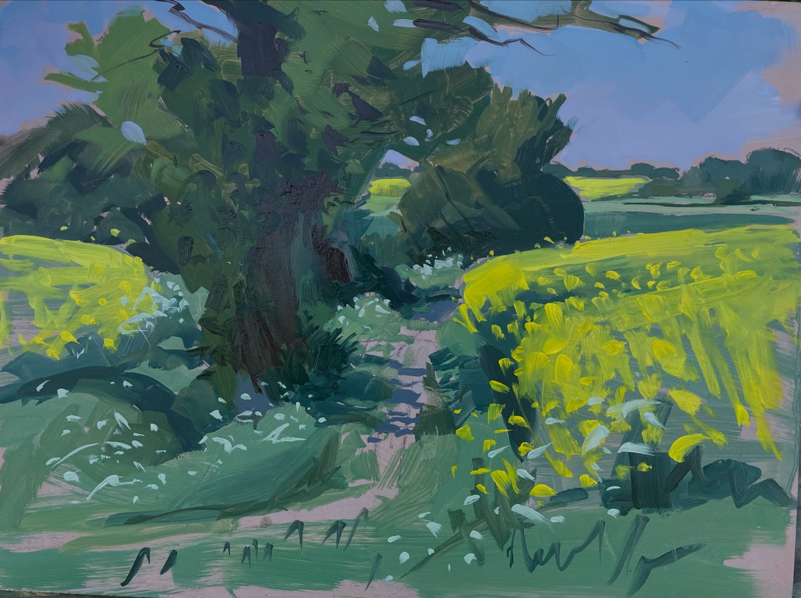 Capturing the last of the rapeflower, as the cow parsley burst into bloom. I was taken by the swathes of yellow winding up to the horizon. This was a hot day where I sought the shade of an old oak tree and felt the excitement of Summer approaching. Painted early May 2025, in two hours.