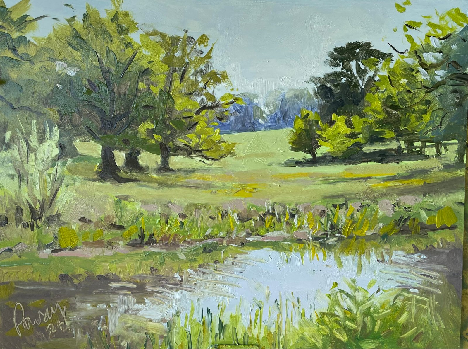 I had hoped for lillipads, but since there were none, I chose to paint this luscious and vibrant scene of late Spring. Just as I’d set up to paint, I was approached by a worker on the grounds. I was expecting to have to apologise profusely, and be on my way, but he assured me that I was alright. He told me that the lilies should be up in a couple of weeks, and I wouldn’t be in anyone’ s way until the fishing season began in a month’s time. He’d come out to feed the fish, something past it’s best from his fridge – a nice old boy I thought. Painted late May 2024, in three hours.