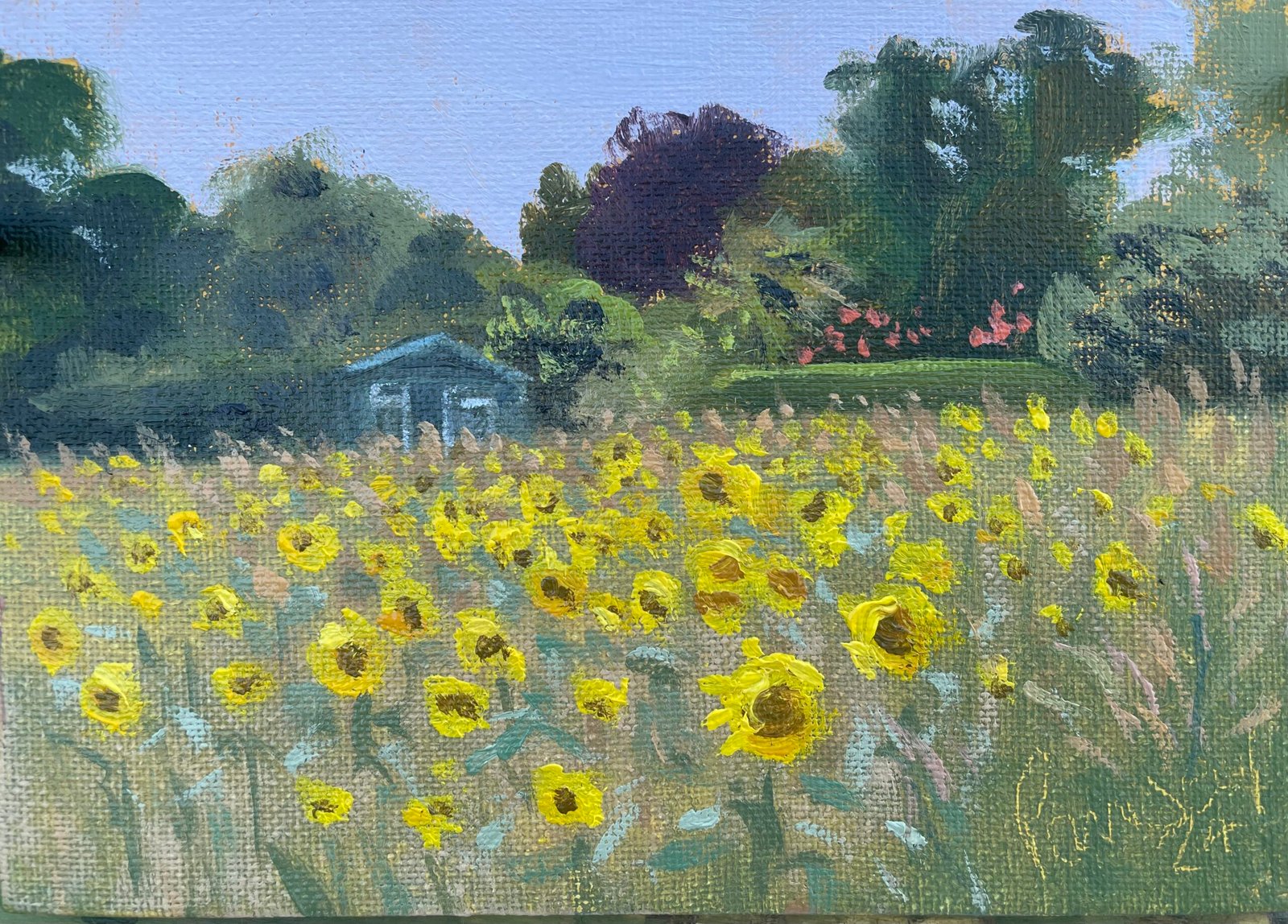 A field of sunflowers is such a wonderful sight. Whilst painting I was thinking how fortunate the owner of that summerhouse is. Painted start of September 2024.