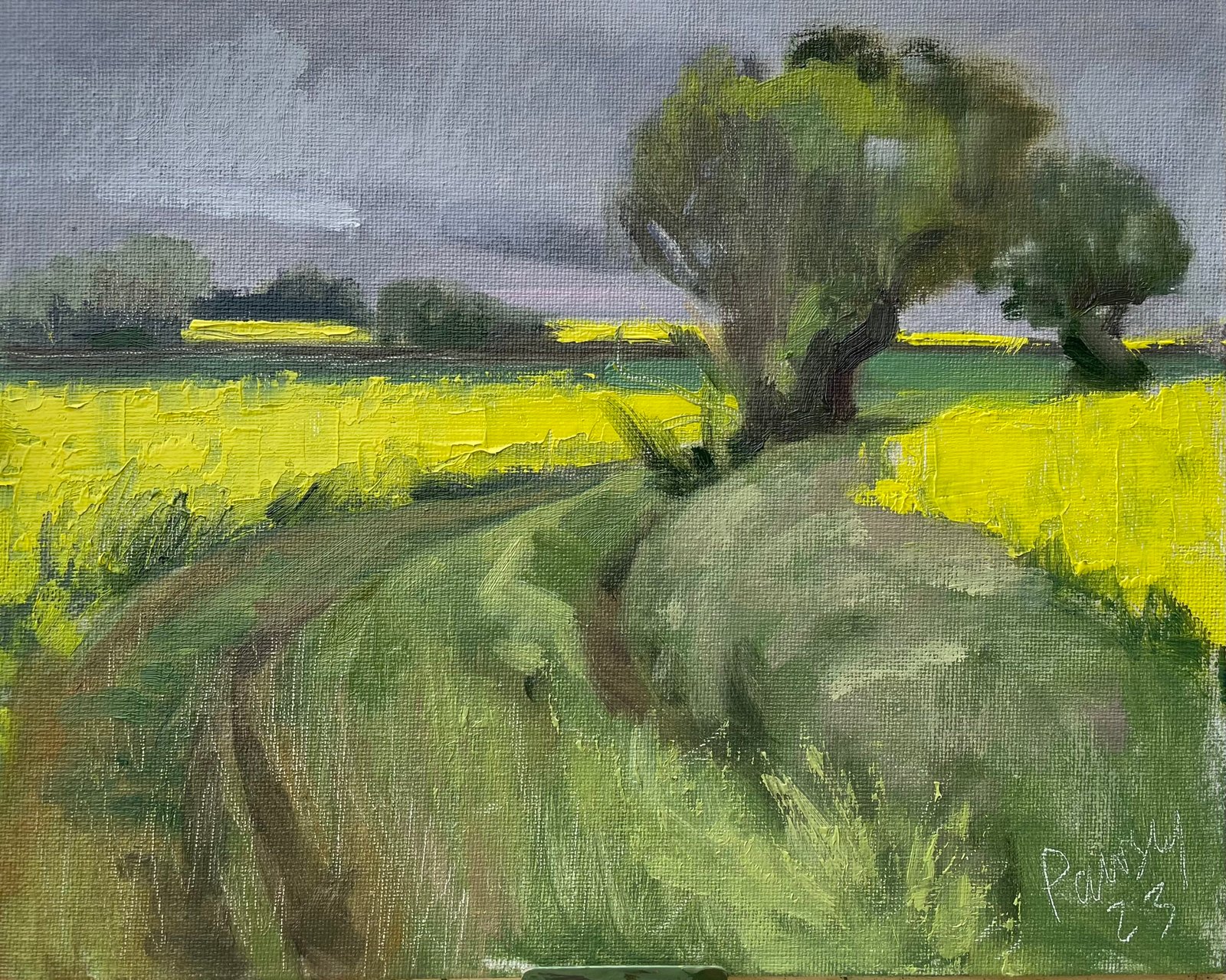 Having not found the time to paint outdoors in almost two years, I was seduced by the vibrant yellow of the rape fields. The approaching rain allowed no time to overwork this quick impression. Painted on Farm Walk in mid May 2023.